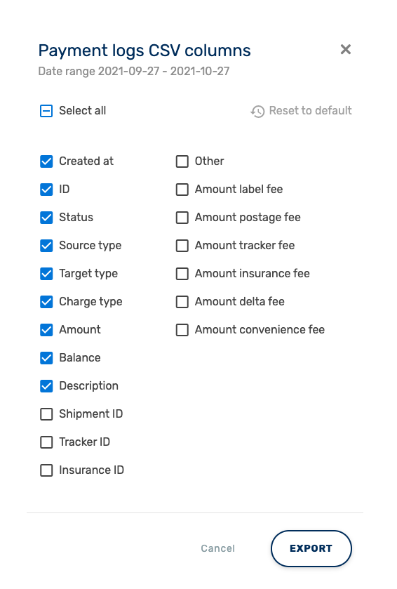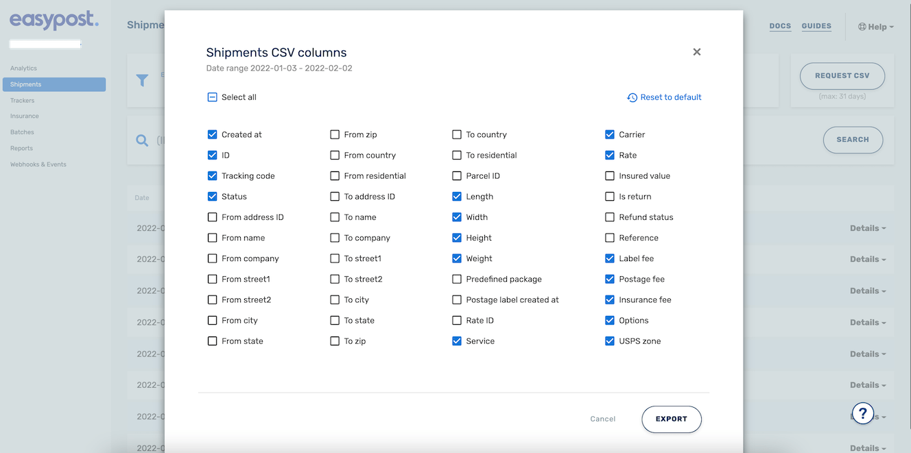 You can now customize which columns you would like to include in your reports – for all six reports. This can be done directly within the EasyPost dashboard by selecting which fields to include in the report or using the `columns` parameter in the reporting API.