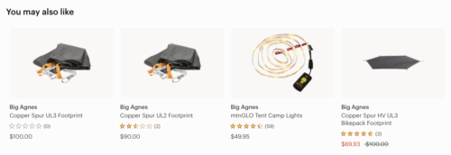 Example: On an REI product page for a kayak, they include a “Complementary Items” carousel featuring different paddles, and the product page for a tent has a “You may also like” section with various tent accessories.