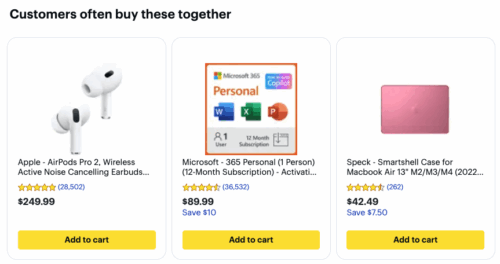 Example: On the Best Buy checkout page for a MacBook, shoppers can learn more about AppleCare+ protection services and choose a three- or four-year plan. The page also includes a “Customers often buy these together” section with products like AirPods, a Microsoft subscription, and a laptop case.
