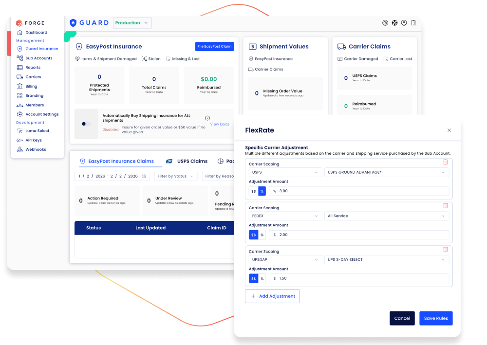 Enter the market in minutes with Forge, EasyPost’s answer for businesses that need a reliable, flexible, and scalable white-label shipping solution. Forge provides access to the most reliable end-to-end shipping APIs, code-free sub-account management, and actionable insights, all from one centralized platform.