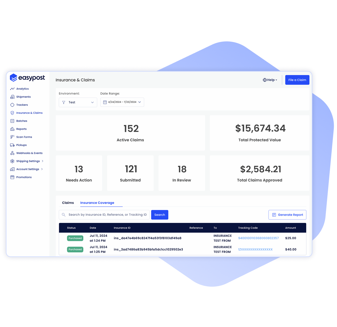 EasyPost’s Claims API is the perfect complement to our Shipping Insurance. With the API you’ll be able to take control of your post-purchase experience by integrating our claims process into your platform and styling it to match your brand. This can increase your claim filing speed and post-purchase experience.